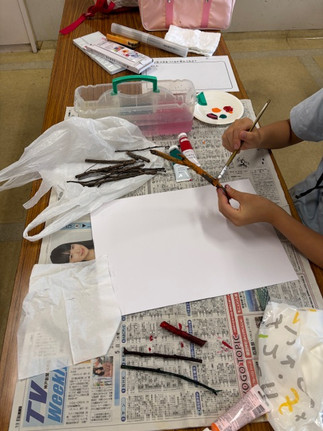 野外に出て、いろいろな形や長さの木の枝を探し、教室に戻って、アクリル絵の具で枝を塗り、1枚の作品を